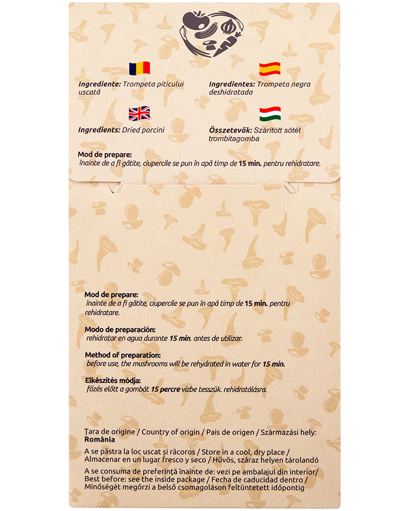 Directions: Before cooking, keep the mushrooms in water for 15 minutes for rehydration. After rehydration you can use them to prepare your favorite recipes: pasta, soups, risotto, sauces or side dishes.